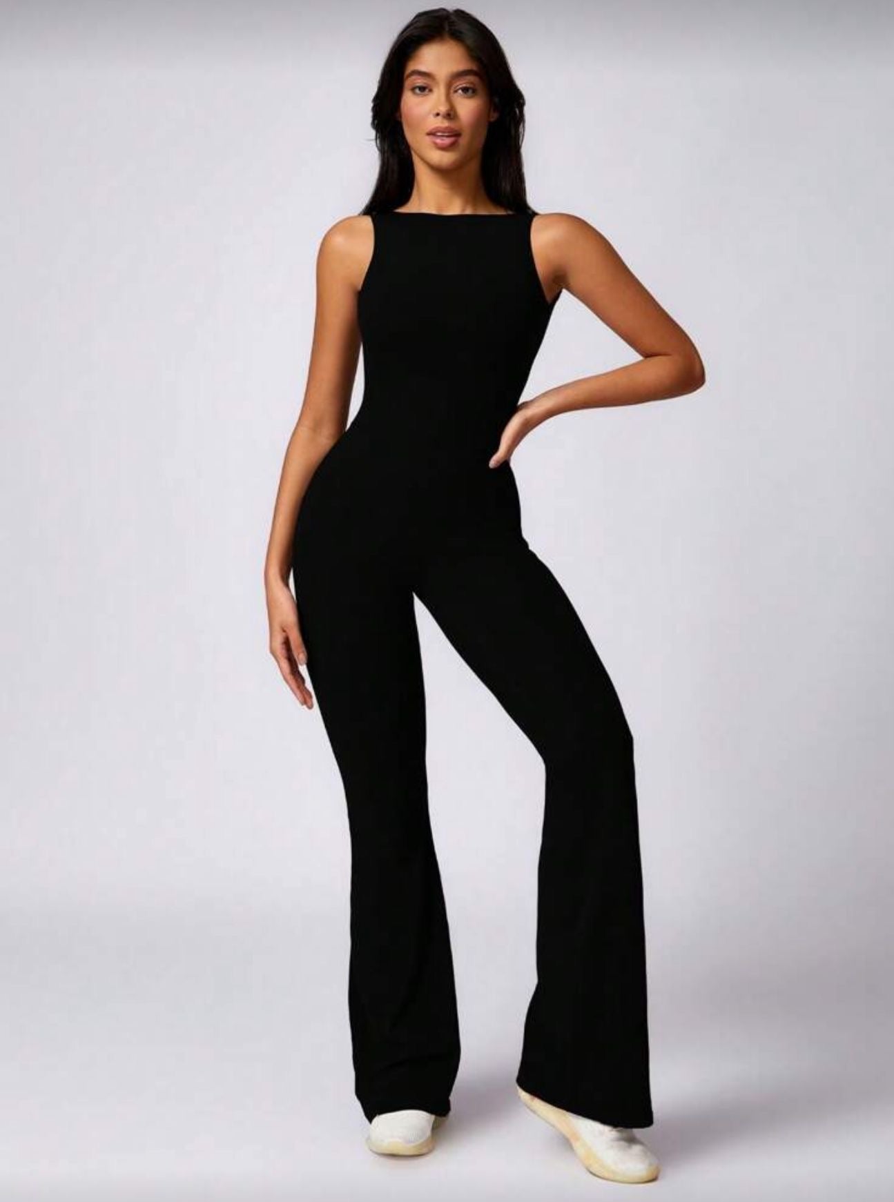 Macacão flare em poliamida.